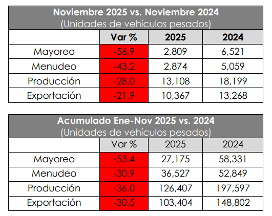 En el penúltimo mes del año, las ventas al mayoreo de vehículos pesados alcanzaron un total de 2,809 unidades, lo que representa una baja del 56.9% en comparación con el mismo mes de 2024. En el acumulado de enero a noviembre, las ventas al mayoreo se situaron en 27,175 unidades, lo que implica una reducción del 53.4% respecto a las 58,331 unidades registradas en el mismo periodo del año pasado. En el mes de noviembre, se observó un repunte en las ventas al mayoreo de 7.9 % con respecto al mes anterior.