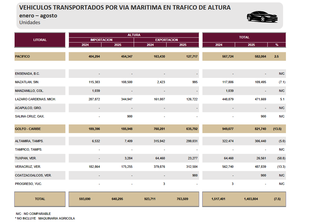 Entre enero y agosto de 2025, los puertos mexicanos de tráfico de altura movilizaron 1,403,804 vehículos, lo que representa una caída de 7.5% frente a las 1,517,401 unidades registradas en el mismo periodo de 2024. El comportamiento por litoral muestra una tendencia contrastante: mientras el Pacífico logró un ligero crecimiento, el Golfo–Caribe sufrió una baja de dos dígitos.