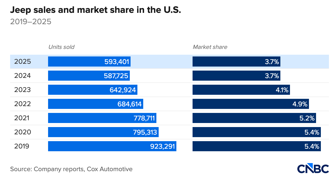 Entre 2019 y 2025, las ventas de Jeep en Estados Unidos cayeron de 923,291 unidades a 593,401, mientras su participación de mercado pasó de 5.4% a 3.7%, según datos de Cox Automotive citados por CNBC. Stellantis busca revertir esta tendencia mediante una expansión acelerada de su portafolio electrificado.