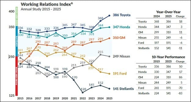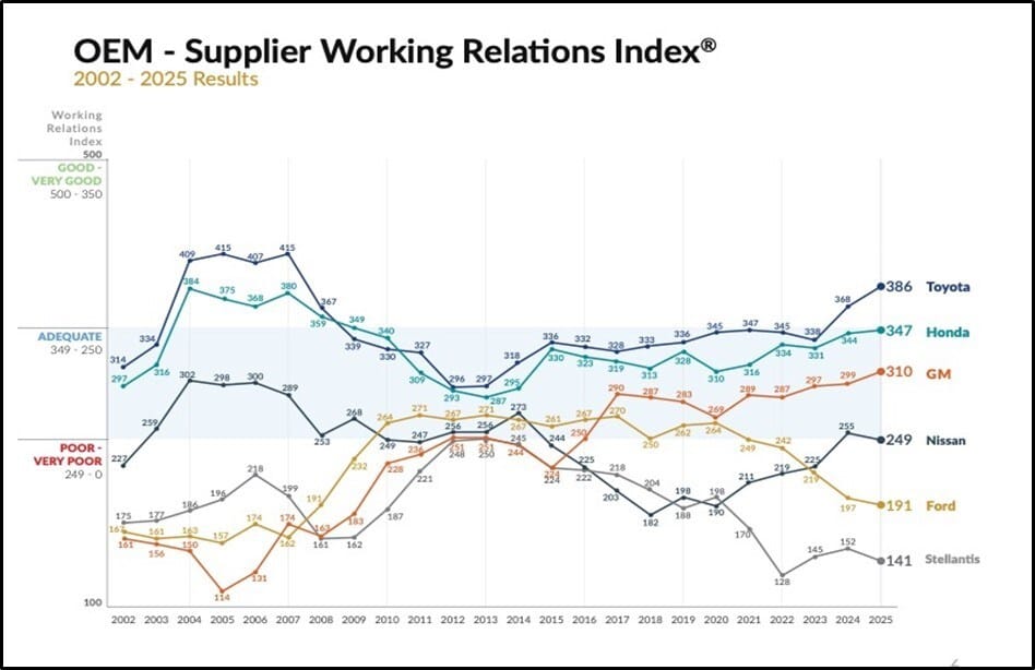 Ahora en su año número 25, el Estudio 2025 del Índice de Relaciones Laborales entre OEM y Proveedores Tier 1 del sector automotriz de América del Norte fue realizado por Plante Moran entre mediados de febrero y mediados de abril. Los encuestados son ejecutivos de proveedores Tier 1 que trabajan con Ford, General Motors, Honda, Nissan, Stellantis y Toyota. El estudio anual rastrea la percepción de los proveedores sobre sus relaciones laborales con los fabricantes de automóviles, evaluándolos en ocho áreas principales de compras divididas en 20 segmentos de productos.