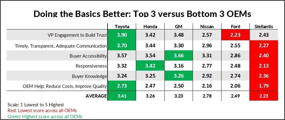 Los OEM en el Top 3 obtienen mejores puntajes en aspectos básicos: comunicación, capacidad de respuesta, accesibilidad, involucramiento y conocimiento del comprador. "Estas habilidades ayudan a los proveedores a operar con mayor eficiencia y, a su vez, crean relaciones sólidas", explicó Johnson. "Relaciones más fuertes permiten que los OEM y los proveedores trabajen juntos y naveguen mejor la incertidumbre de la industria con una distribución más equitativa de riesgos y costos".