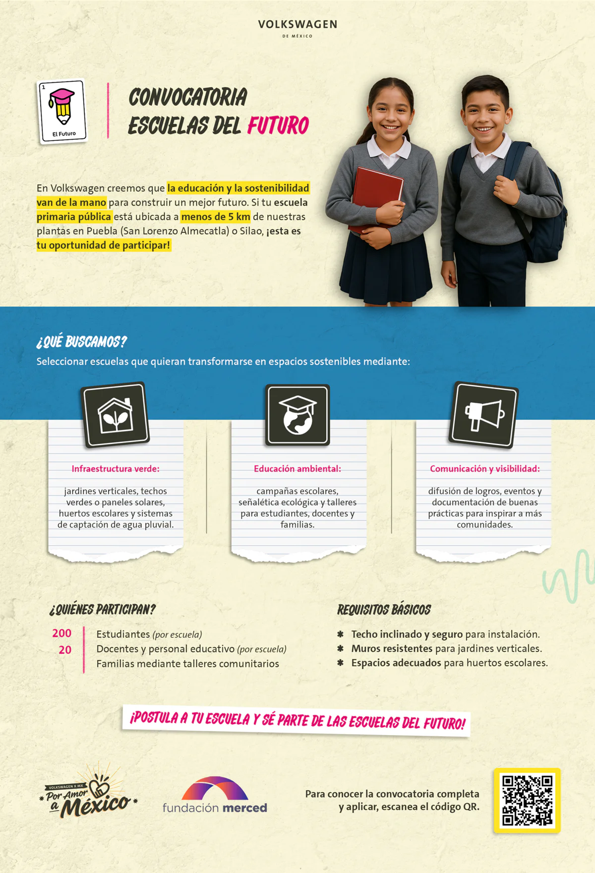 Puebla, Pue., 13 de enero de 2026. — Volkswagen de México, en alianza con Fundación Merced, lanzan la convocatoria “Escuelas del Futuro 2026”, una iniciativa que busca transformar dos escuelas primarias públicas, una en Puebla y otra en Silao, Guanajuato, en modelos de infraestructura verde, educación ambiental y participación comunitaria, fortaleciendo el desarrollo sostenible en las localidades donde la armadora tiene presencia. Esta acción se enmarca en su estrategia de Responsabilidad Social “Por Amor a México” y en la contribución activa de Volkswagen de México a los Objetivos de Desarrollo Sostenible, especialmente educación de calidad, ciudades y comunidades sostenibles, y acción por el clima.