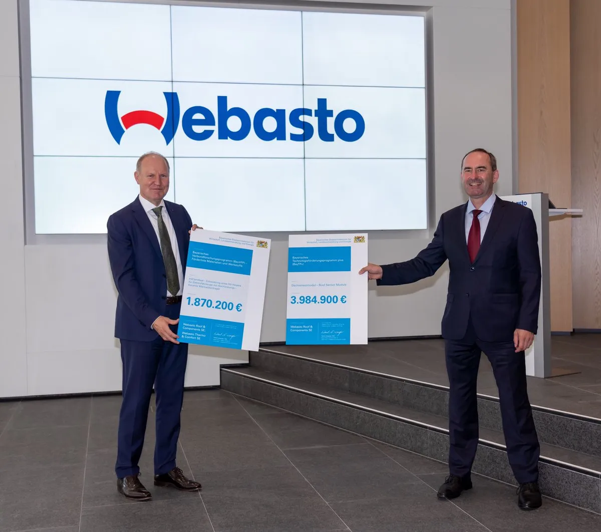 Durante una visita a la sede de la empresa, el ministro de Estado de Economía, Desarrollo Regional y Energía de Bavaria, Hubert Aiwanger, entregó a Holger Engelmann, presidente del Consejo de Administración de Webasto SE, dos certificados que representan un total de seis millones de euros en financiación.