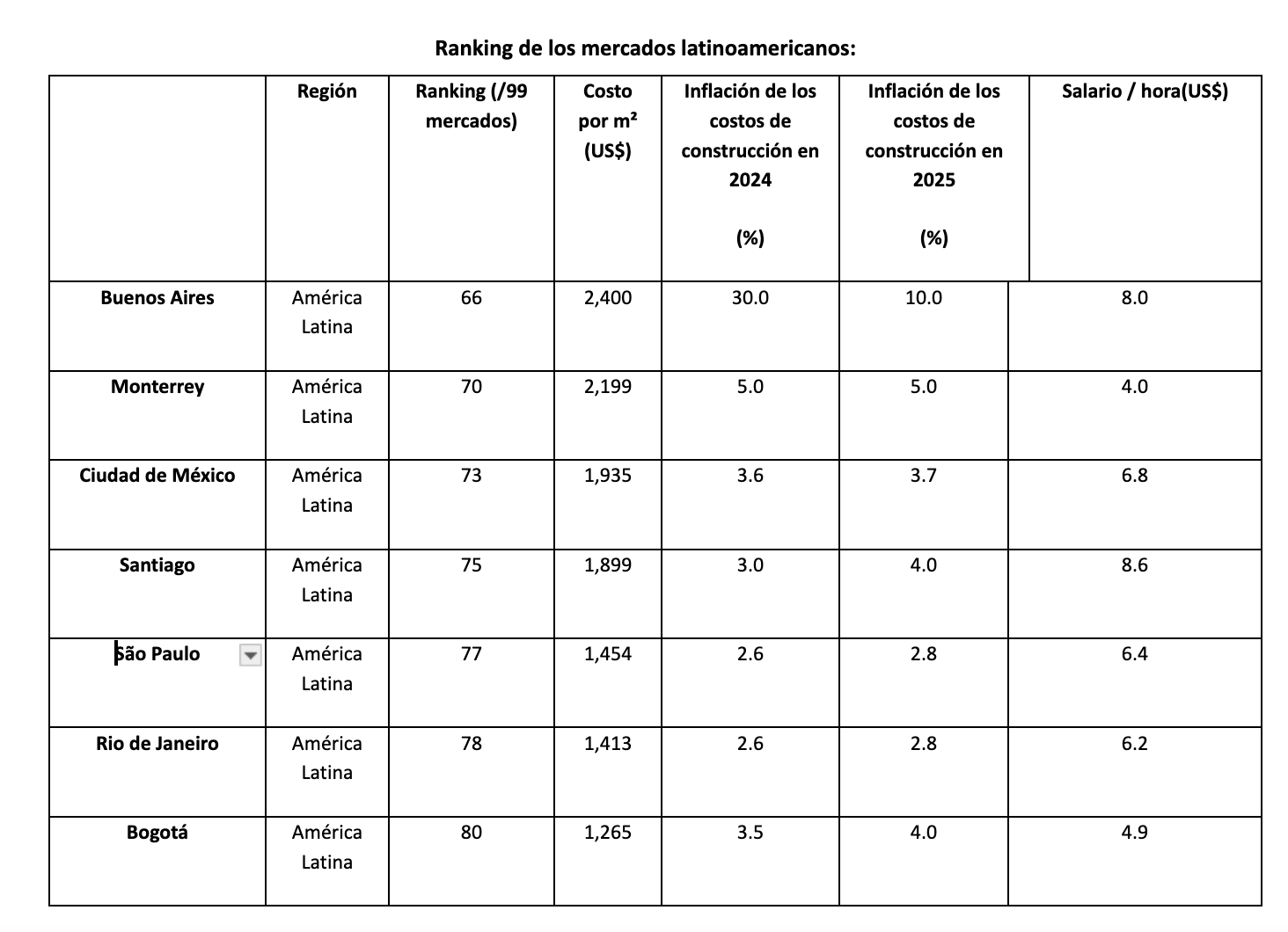 El costo de construcción bajó gradualmente en América Latina, en comparación con otros mercados globales, lo que está ayudando a atraer inversionistas, incluso frente a la incertidumbre sobre el comercio internacional y la política interna en algunos países. En este análisis de los mercados de construcción de 99 ciudades globales, todos los mercados latinoamericanos están posicionados en la mitad inferior del ranking.