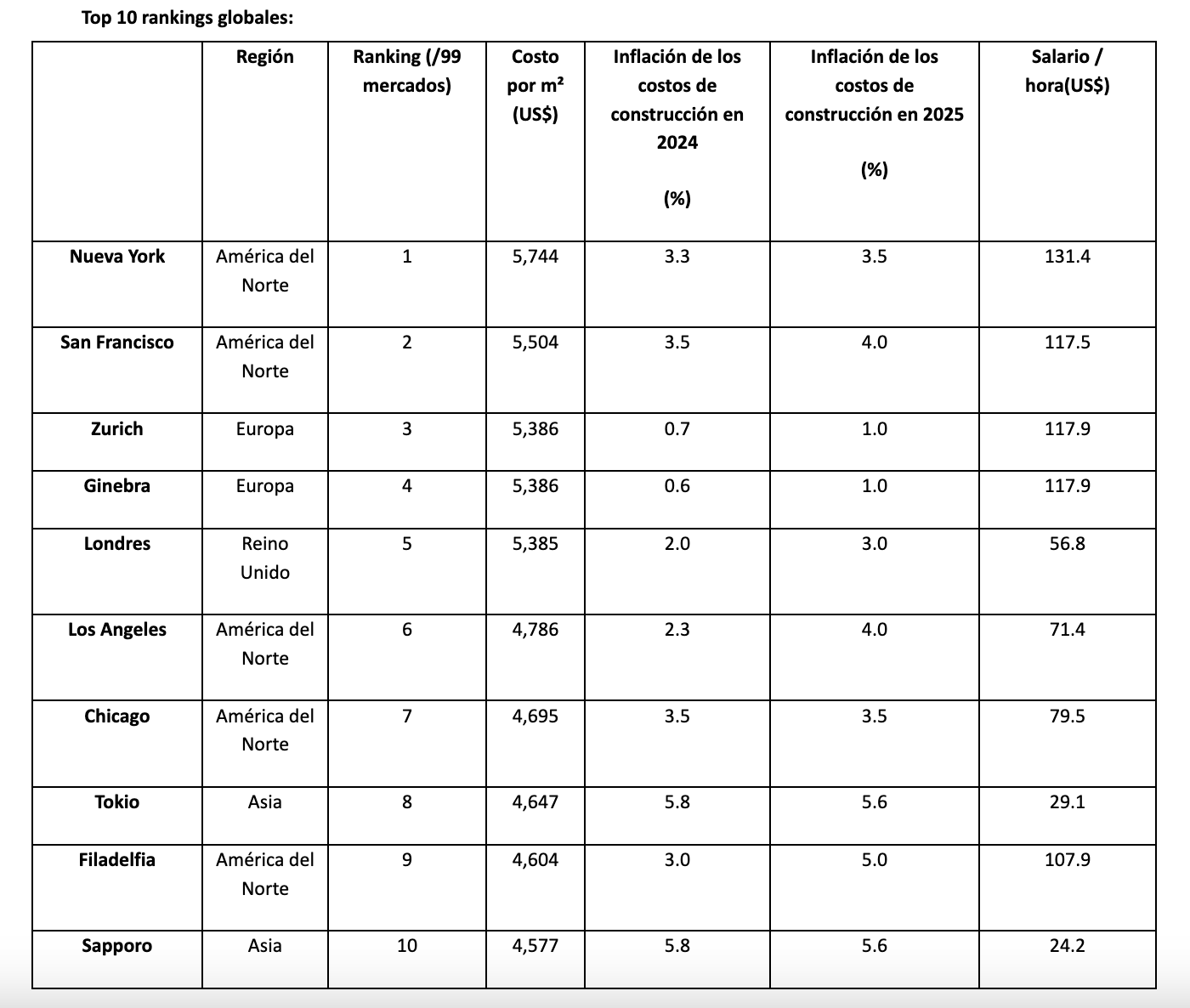 El GCMI muestra que Estados Unidos mantiene una posición dominante en los primeros lugares del ranking de los lugares más costosos para construir. Cinco ciudades estadounidenses se encuentran entre las diez más caras. Nueva York ocupa el primer lugar, con un costo promedio de 5,744 dólares estadounidenses por metro cuadrado, seguida de San Francisco con 5,504 dólares. Los Ángeles (4,786 USD) se posiciona en sexto lugar, Chicago en séptimo (4,695 USD) y Filadelfia en noveno (4,604 USD).