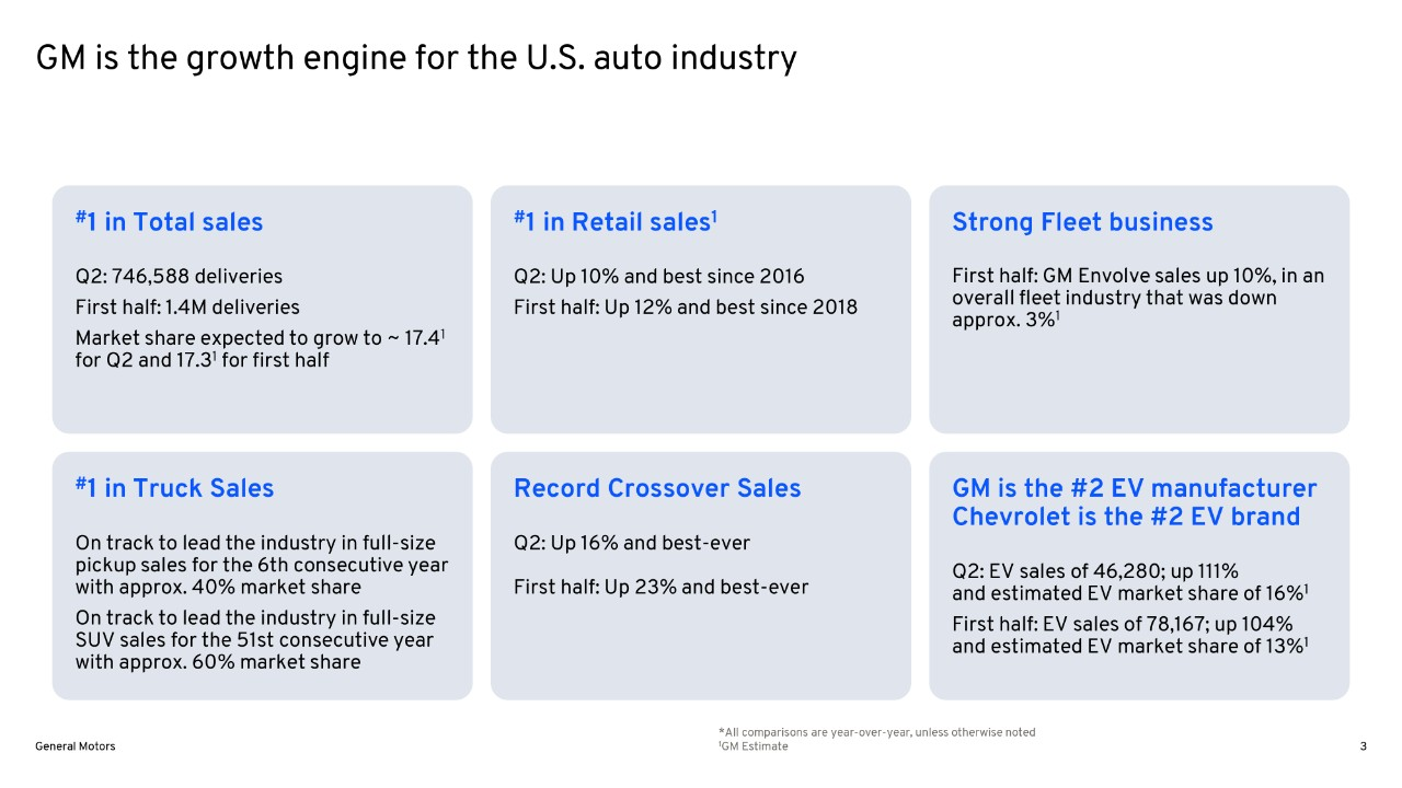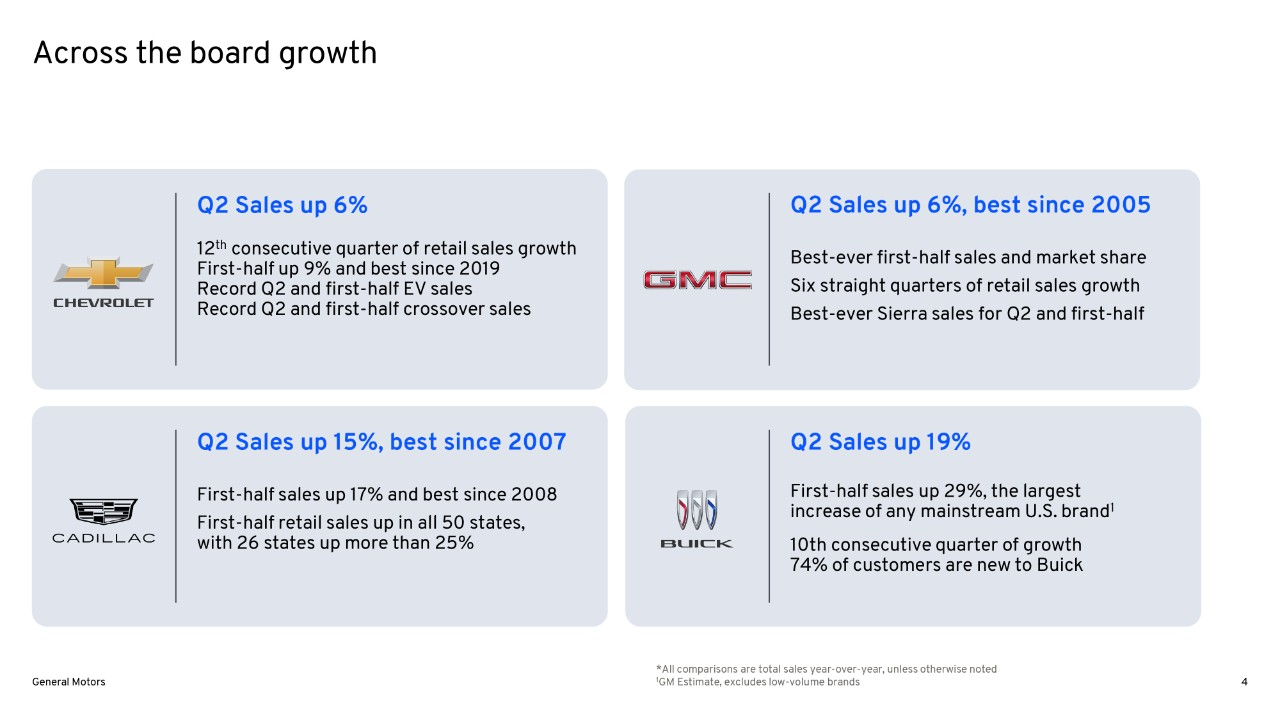 Chevrolet registró su mejor primer semestre desde 2019, con un incremento del 9%. Chevy alcanzó ventas récord en su línea de crossovers, encabezada por ventas históricas del Equinox. Junto con el mejor inicio de año de GMC, que incluyó entregas récord de Sierra, GM se perfila para su sexto año consecutivo como líder en ventas de pickups de tamaño completo y su año número 51 como líder en ventas de SUVs de tamaño completo.