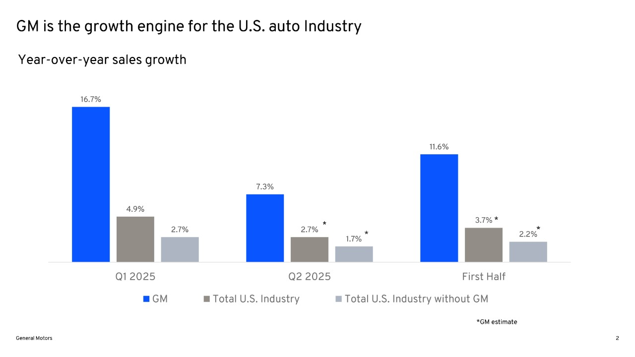 En la primera mitad de 2025, GM lideró la industria automotriz de Estados Unidos en ventas totales y ventas al menudeo. Nuestras ventas en EE.UU. aumentaron un 7% en el segundo trimestre y un 12% en el primer semestre del año. Esto coloca a GM muy por encima del crecimiento estimado del 4% para toda la industria automotriz.
